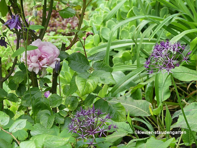 Sachsenperle hat ihre erste Blüte geöffnet und bildet ein harmonisches Trio mit Allium und Akelei.